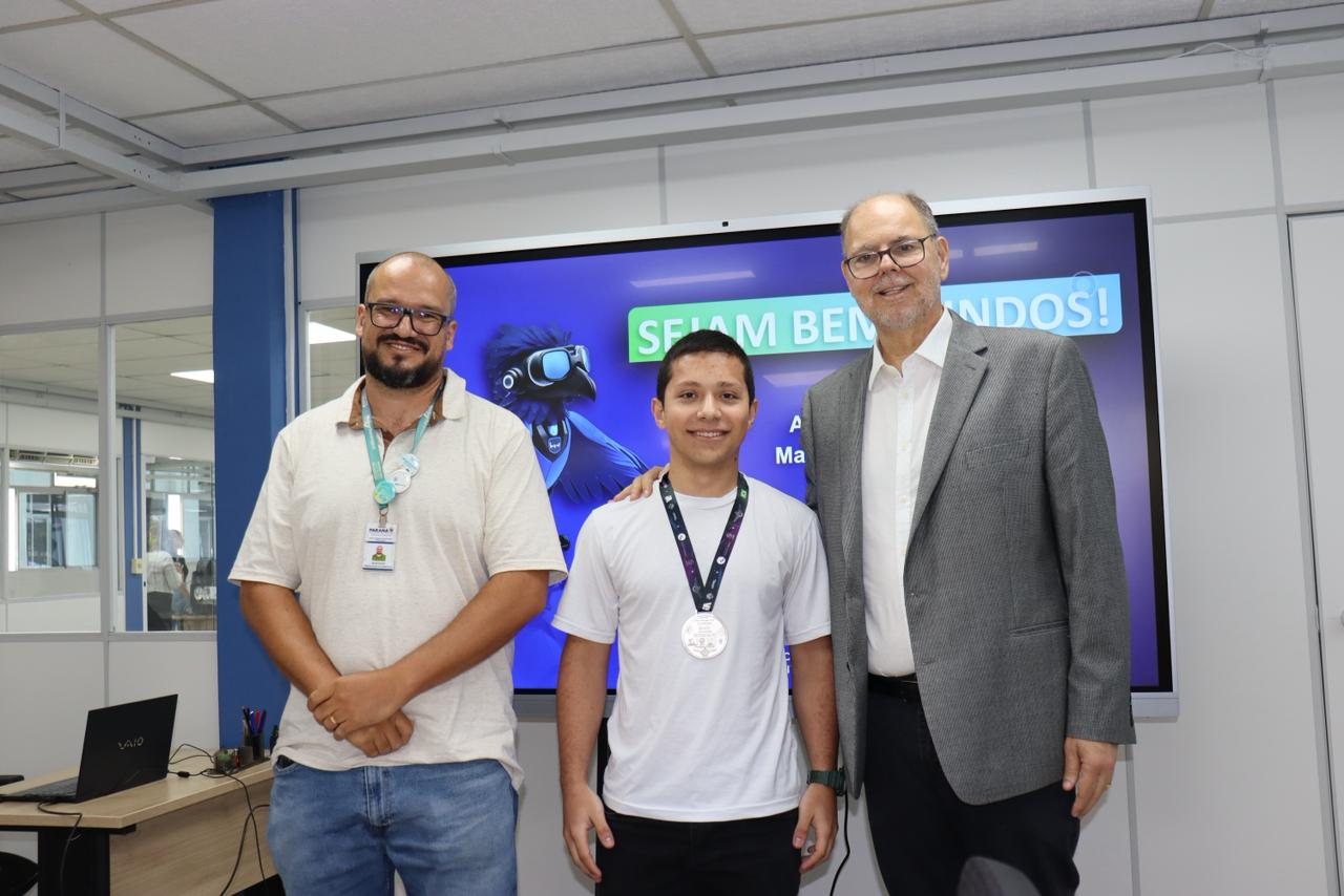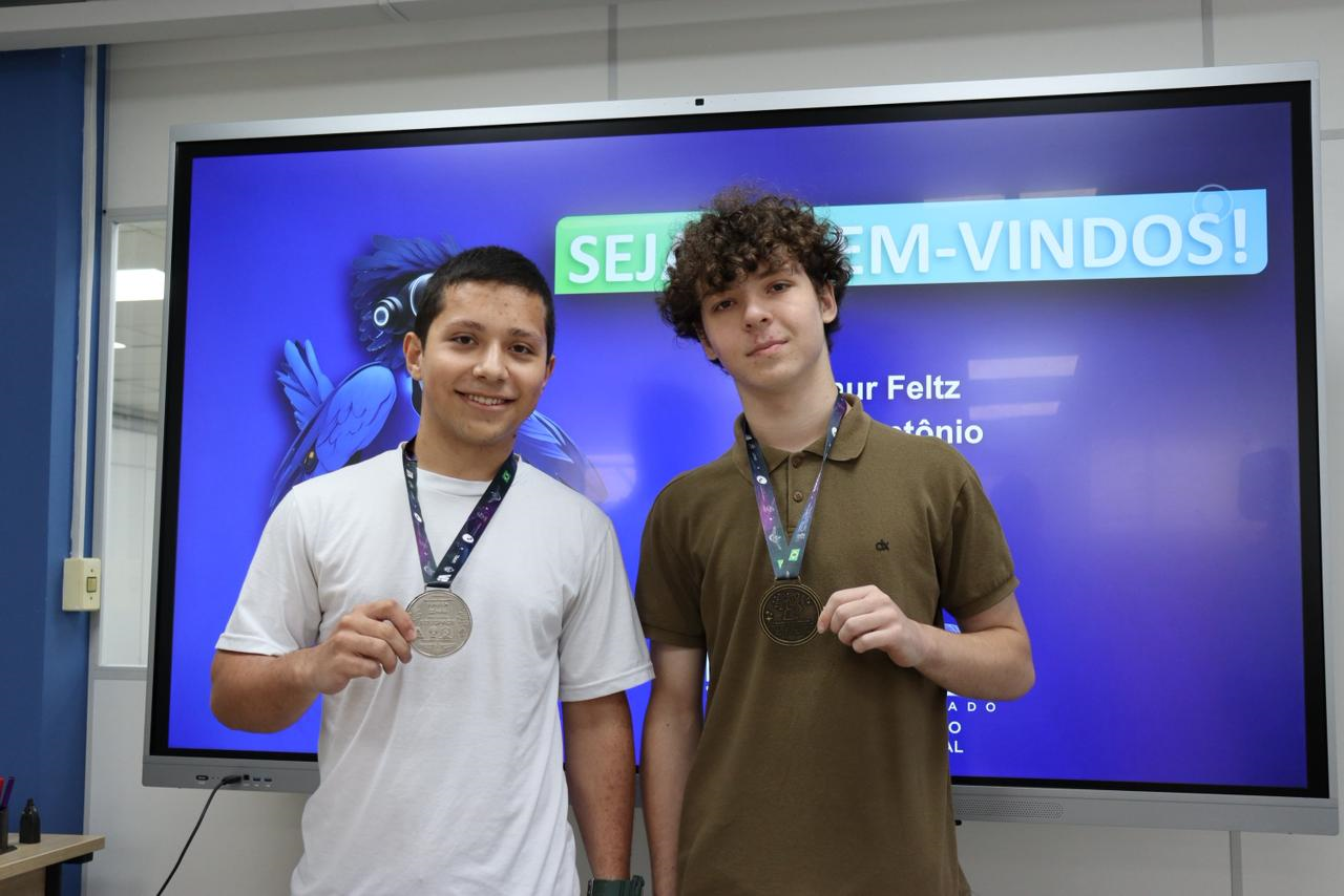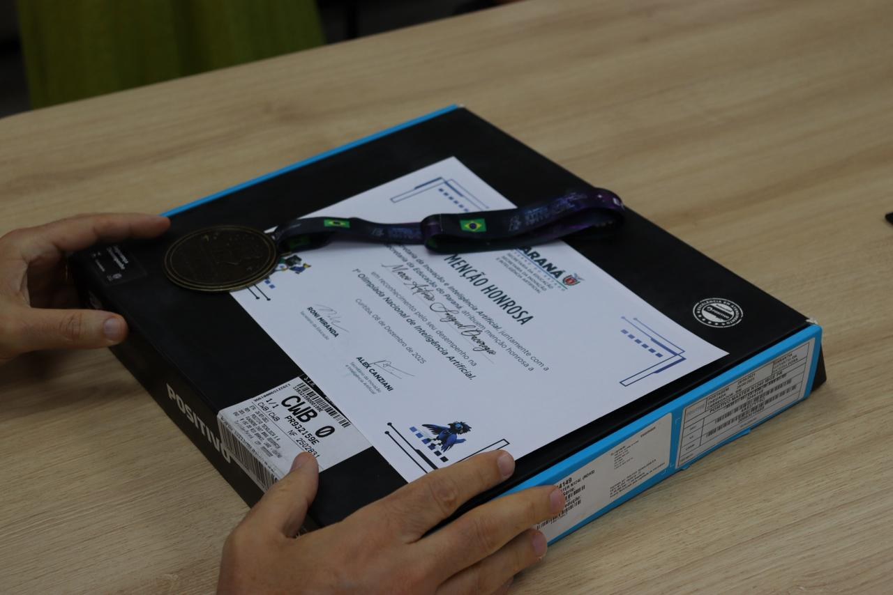 Dois estudantes paranaenses foram homenageados nesta segunda-feira (19), pelo desempenho de destaque na Olimpíada Nacional de Inteligência Artificial (ONIA). A entrega da premiação, realizada pelo secretário da Inovação e Inteligência Artificial do Paraná, Alex Canziani, integra o reconhecimento aos 65 alunos do Estado que conquistaram medalhas na competição nacional. Além das medalhas, os alunos receberam um notebook.