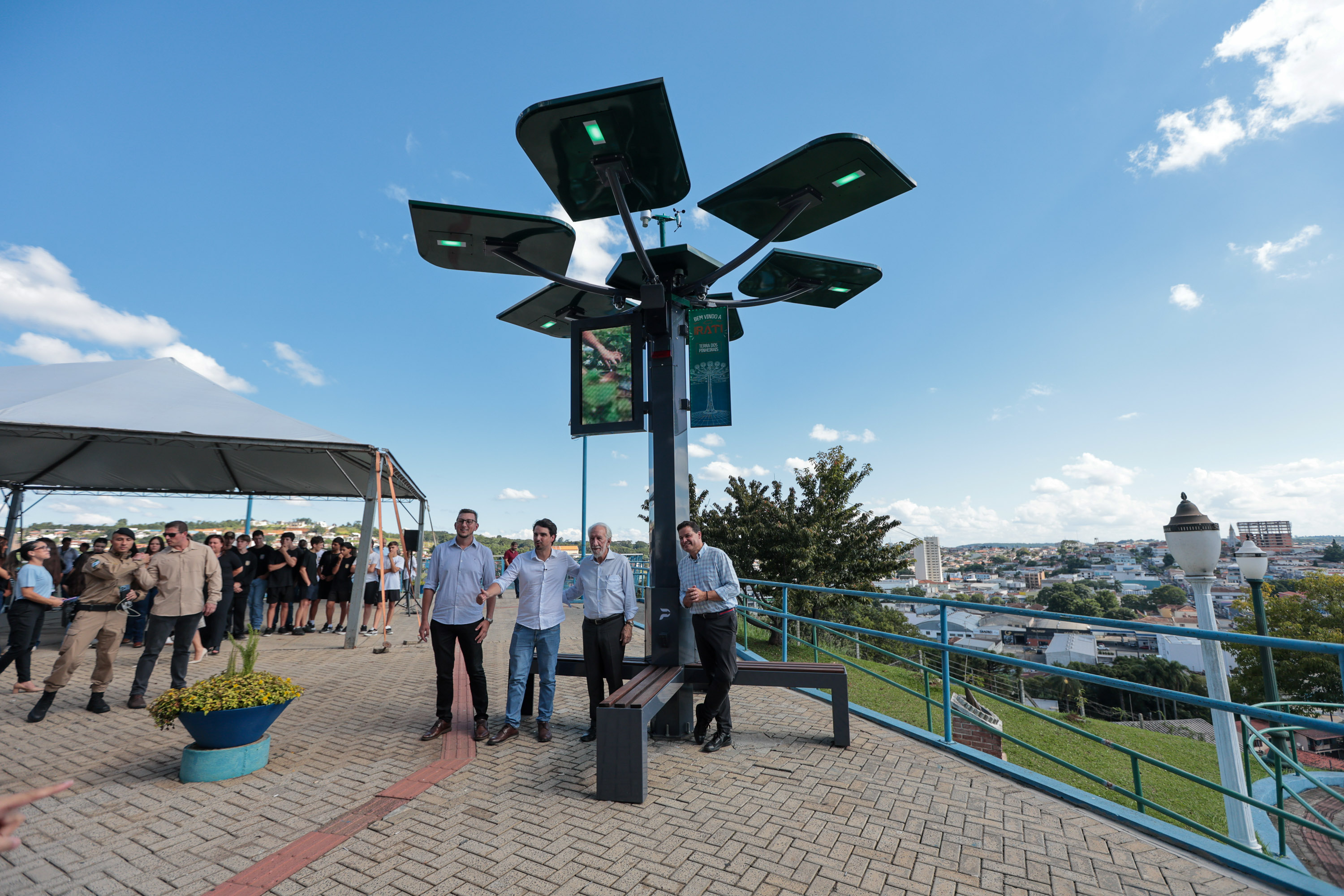 Trata-se de um totem inovador multifuncional com aproximadamente seis metros de altura e quatro de copa, reunindo diferentes subsistemas embarcados em uma única estrutura. Entre os recursos disponíveis estão conectividade Wi-Fi de última geração, sistema de vigilância por vídeo com inteligência artificial, estação meteorológica, carregamento de dispositivos móveis, bancos integrados para descanso e painéis de LED para transmissão de informações institucionais, além de iluminação inteligente.