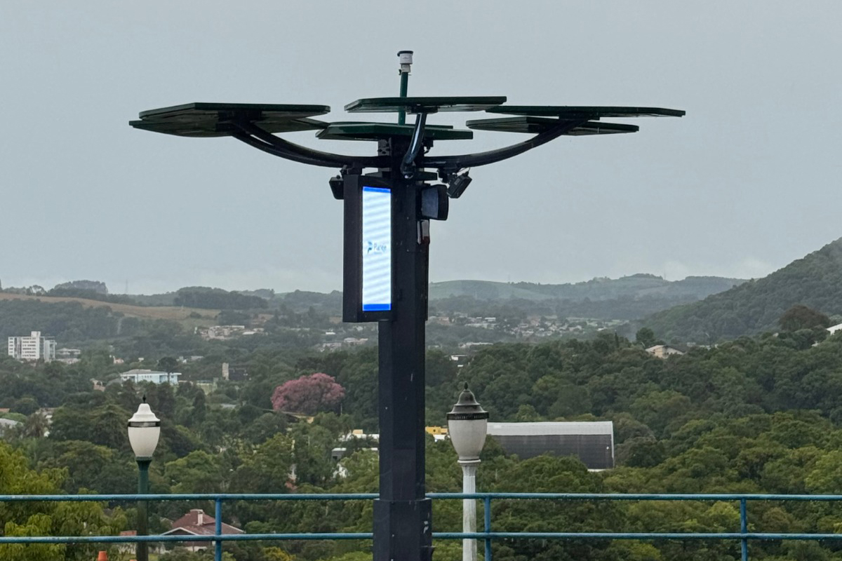 NA PRÁTICA – Entre as funcionalidades da Araucária Digital estão câmeras de monitoramento instaladas nas “folhas” da estrutura, estação meteorológica com possibilidade de integração de dados com autoridades municipais e Defesa Civil, painéis solares para geração de energia, pontos de carregamento de celulares e banco na base para uso de visitantes.