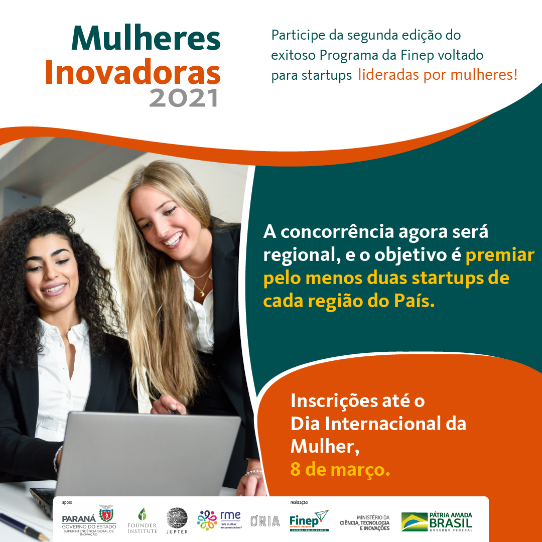 Estão abertas as inscrições para o Prêmio Mulheres Inovadoras 2021, promovido pela Finep – Financiadora de Inovação e Pesquisa e pelo Ministério da Ciência, Tecnologia e Inovações (MCTI). O prêmio conta com o apoio do Governo do Paraná, por meio da Superintendência Geral de Inovação, vinculada à Casa Civil. As inscrições vão até 8 de março.