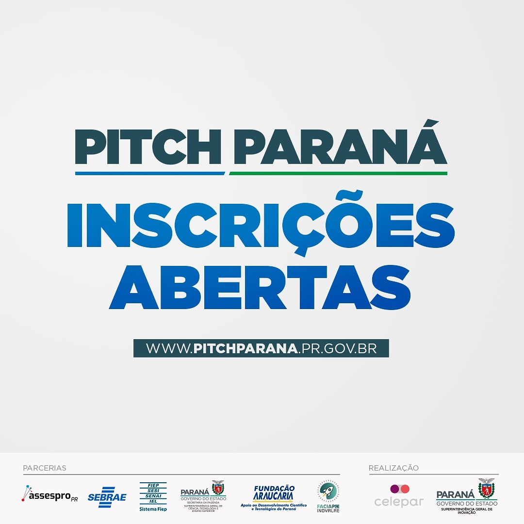 Terminam na sexta-feira (16) as inscrições para o Pitch Paraná, criado pelo Governo do Estado para identificar ideias inovadoras e tecnologias inclusivas nas áreas de Agronegócio, Saúde, Governo, Transformação Digital e Empreendedorismo Social. Dirigido a startups, o projeto foi idealizado pela Superintendência Geral de Inovação, vinculada à Casa Civil, e conta com o apoio da Celepar e da Superintendência de Ciência, Tecnologia e Ensino Superior, e a parceria da Assespro, do Sebrae e da Fiep.